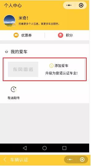 雷诺车主,厂家福利大派送 小诺准备大声地告诉您: 是时候动动手 把小诺为您准备的精美礼品 带回家啦! 一等奖:东风雷诺云伴远程视频车 二等奖:东风雷诺反向伞 方便车主而贴心设计,大雨来临之时,只需小小的车门缝,就可以开收伞自如。 三等奖:东风雷诺定制手机支架 强韧有力的工艺设计,保证手机在行车途中不会晃动、掉落。让开车接听电话更安全。 诺米们是不是已经按捺不住了 快跟着小诺 收下攻略,动动手指 把礼品带回家吧! 先关注东风雷诺车友会官方微信公众号 返回东风雷诺车友会主页面,点击左下角菜单栏【个人中心】,进入车主认证通道。 认真填写爱车信息,上传行驶证主页、副业。在行驶证上能找到您的车辆识别代号和发动机号,再输入手机号和验证码,即可绑定成功啦! 完成认证,便可以开始抽奖啦!注意:一位车主只有一次抽奖机会哦。 如您中奖,您将会收到一条中奖短信通知 务必在1个月内凭中奖短信到武汉法雷专营店领取礼品 *注:本次活动仅限未认证会员的车主参与