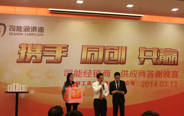 ??????? 2014年3月12日,在江蘇溧陽御水溫泉酒店內(nèi),一場(chǎng)盛大的訂貨會(huì)正在進(jìn)行,這是廣西柳工高級(jí)潤滑油有限公司舉辦的一場(chǎng)以“攜手 同創(chuàng) 共贏“為主題的大規(guī)模訂貨會(huì)。當(dāng)天共計(jì)有120余人參與該活動(dòng)?!八灸堋睉{借其高品質(zhì)放心油以及強(qiáng)大的公司實(shí)力贏得了客戶的認(rèn)同,當(dāng)天一舉拿下了近千萬元的訂單。