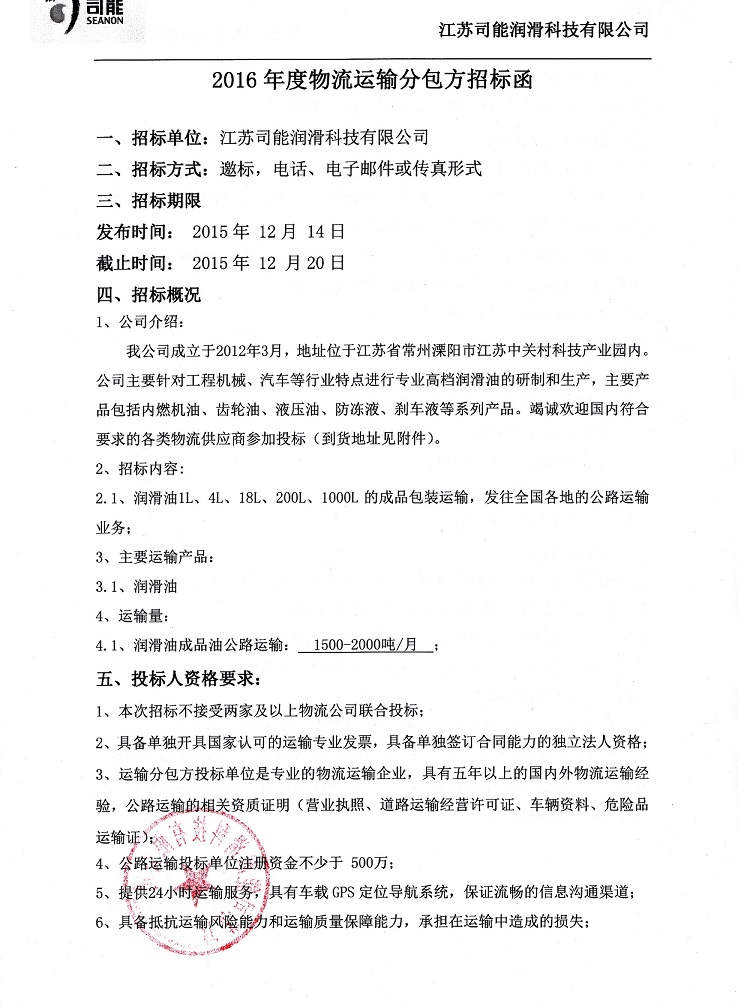 2016年度物流運(yùn)輸分包方招標(biāo)函