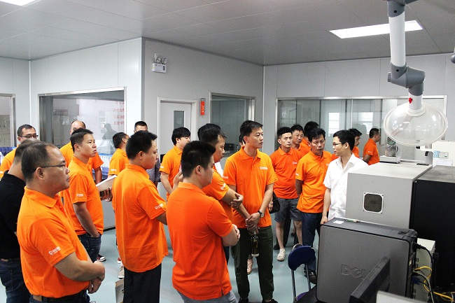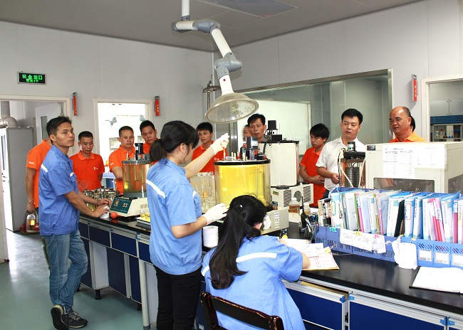 研發(fā)中心主任韋起桂帶領(lǐng)大家參觀了司能的中心實驗室。該中心目前是廣西壯族自治區(qū)內(nèi)技術(shù)水平最高、分析手段最齊全的潤滑油分析評定中心。韋主任針對生產(chǎn)自動化,基礎(chǔ)油采購渠道,先進的技術(shù)檢驗研發(fā)設(shè)備等話題與現(xiàn)場來賓們進行了交流與探討,使之更加拉近與經(jīng)銷商、終端客戶的距離。