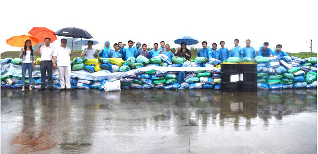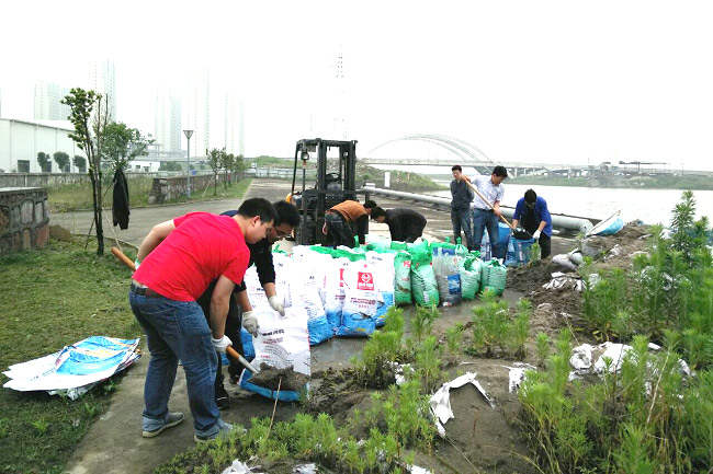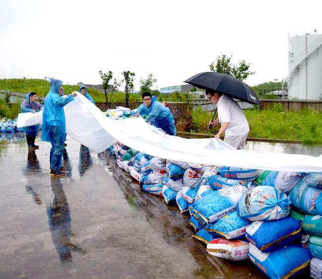 ? ? ? ? 2016年6月28日中午12時(shí)左右,溧陽(yáng)地區(qū)連續(xù)強(qiáng)降雨使蕪申運(yùn)河水位由早上8點(diǎn)的4.5米急速上升至5.5米,水面距離公司碼頭駁岸距離不到0.5米。發(fā)現(xiàn)這一情況,司能石化常務(wù)副總經(jīng)理吳土金立即組織和號(hào)召江蘇司能防汛抗洪小組第一時(shí)間緊急啟動(dòng)一系列防汛抗洪應(yīng)急措施: