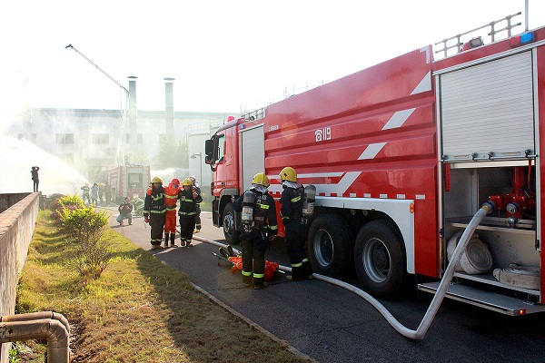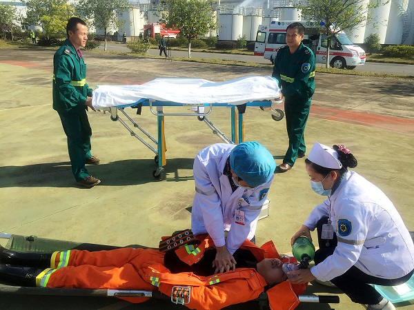? ? ? ? 演練現(xiàn)場(chǎng)設(shè)置在司能石油化工有限公司D401原材料儲(chǔ)罐外,演練科目設(shè)置為員工在對(duì)儲(chǔ)罐進(jìn)行補(bǔ)焊作業(yè)時(shí)突發(fā)火災(zāi),火災(zāi)現(xiàn)場(chǎng)臨近柴油儲(chǔ)罐,兩名微型消防人員進(jìn)行自救時(shí)受傷、昏迷被困現(xiàn)場(chǎng)。演練按先期應(yīng)急處置,企業(yè)自救和緊急疏散,消防大隊(duì)和120急救中心人員現(xiàn)場(chǎng)一起出動(dòng)應(yīng)急救援,污染排查,總結(jié)等五個(gè)環(huán)節(jié)進(jìn)行。整個(gè)演練過程環(huán)環(huán)相扣,有條不紊,各應(yīng)急隊(duì)伍、救援隊(duì)伍緊密配合,協(xié)同作戰(zhàn),最終成功控制了事故損失的進(jìn)一步擴(kuò)大,消除了事故的危害,獲得了圓滿成功。演練歷時(shí)約1小時(shí)30分,共有95人參加演練,出動(dòng)消防車6輛,120急救車1輛,以及安監(jiān)、交警、環(huán)保等應(yīng)急救援車輛3部。